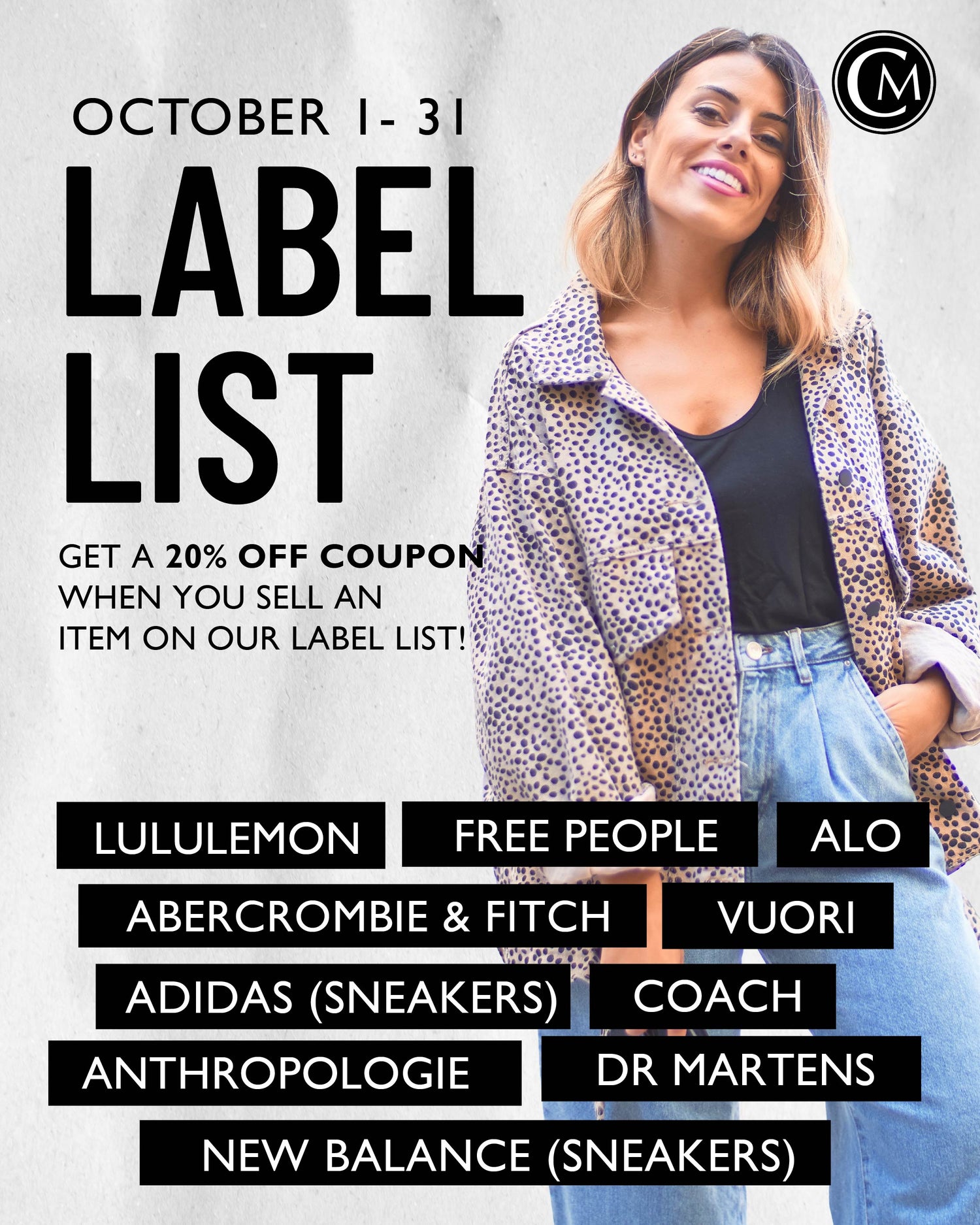Looking to clean out your closet and earn rewards? Bring in items from our October Label List and score a 20% Off Coupon when you sell! We're especially looking for popular brands including: